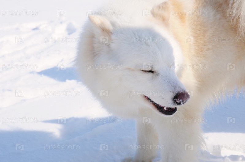 Белая собака Хаски в русском снежном пейзаже в солнечный день