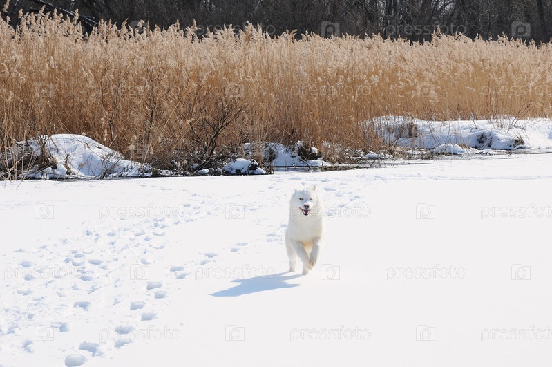 Белая собака Хаски в русском снежном пейзаже в солнечный день