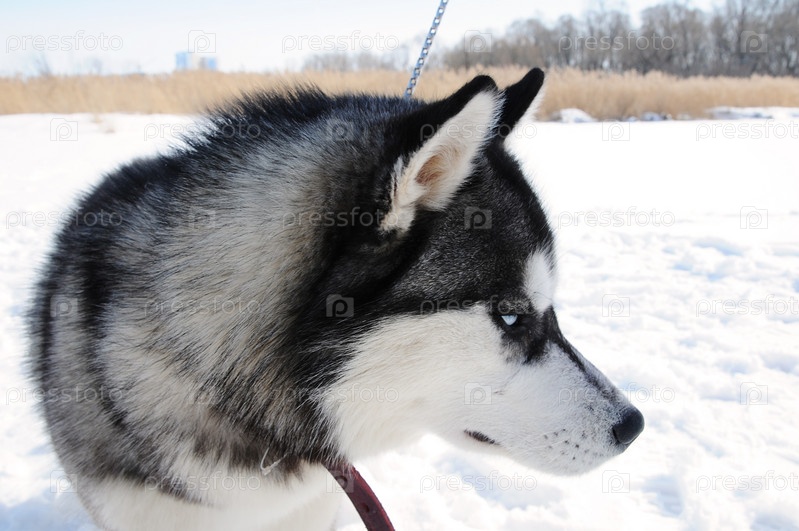 Хаски-собака в русском снежном пейзаже в солнечный день