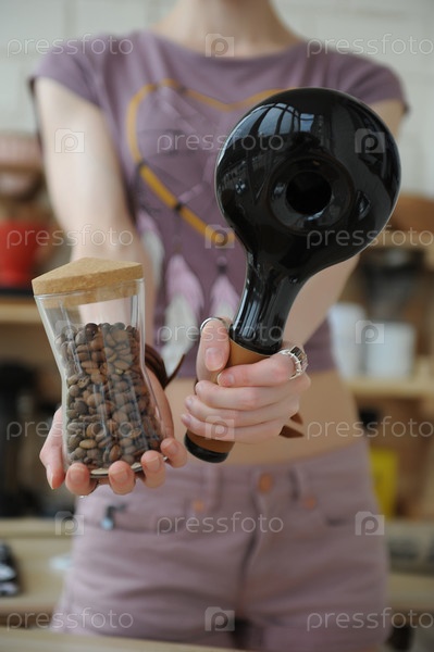 Девушка держит в руках керамический ростер для образцов кофе и стеклянную банку со свежеобжаренными кофейными зернами