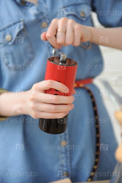 Красная ручная мясорубка в женских руках крупным планом. Бариста варит кофе