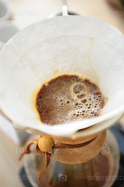 Кофе цветет в бумажном фильтре, вид сверху. Альтернативное ручное заваривание