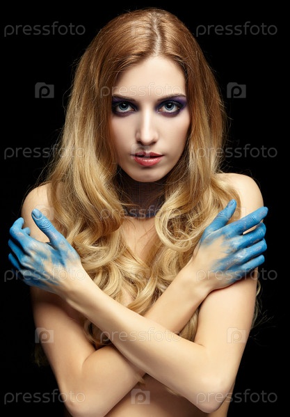 Молодая блондинка с длинными волосами и руками, окрашенными в синюю краску