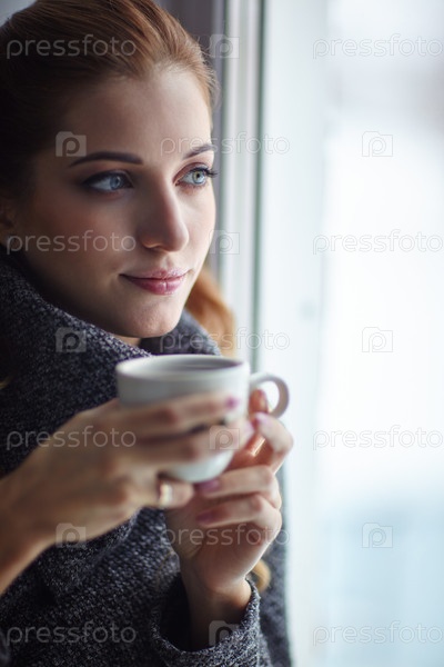 Молодая красивая женщина в шерстяном свитере с белой кофейной чашкой в руках
