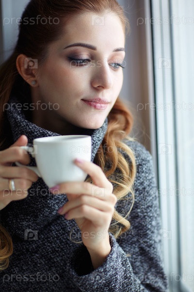 Молодая красивая женщина в шерстяном свитере с белой кофейной чашкой в руках