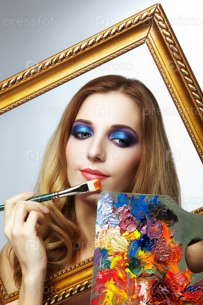 Молодая женщина-художник в золотой раме с цветной палитрой и кистью в руке