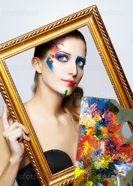 Молодая женщина-художник в золотой раме с цветовой палитрой