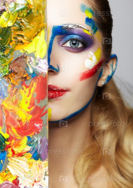 Молодая художница с цветовой палитрой и акриловой краской на лице