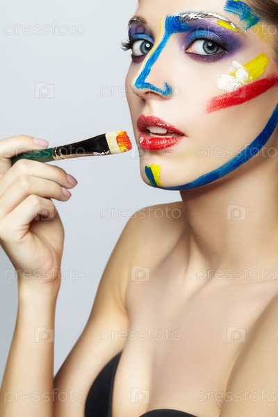 Молодая художница с кистью в руке и акриловой краской на лице
