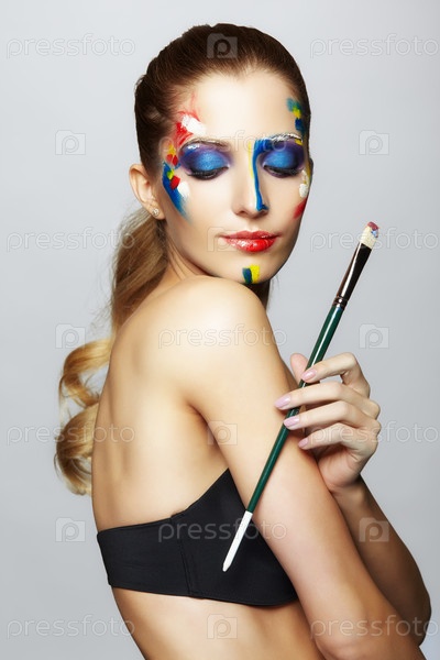 Молодая художница с кистью в руке и акриловой краской на лице
