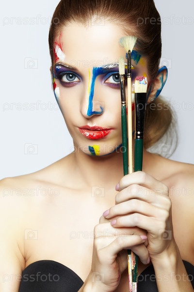 Молодая художница с кистью в руке и акриловой краской на лице