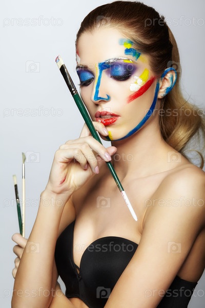 Молодая художница с кистью в руке и акриловой краской на лице