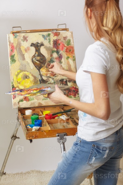 Художница с деревянным альбомом для рисования и живописью