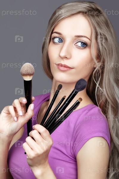 Блондинка-стилист красоты - визажист с кистями для макияжа