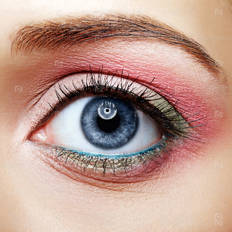 Макроизображение крупным планом человеческого глаза женщины с розовым и зеленым макияжем