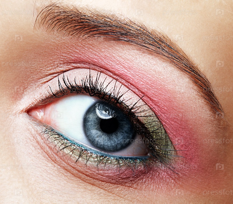 Макроизображение крупным планом человеческого глаза женщины с розовым и зеленым макияжем