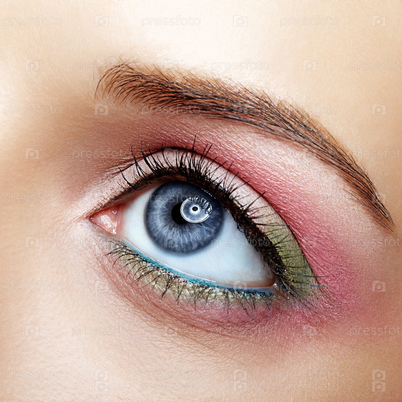 Макроизображение крупным планом человеческого глаза женщины с розовым и зеленым макияжем