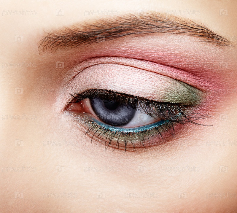 Макроизображение крупным планом человеческого глаза женщины с розовым и зеленым макияжем