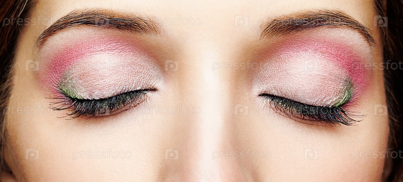 Снимок крупным планом женского лица с закрытыми глазами и розово-зеленым макияжем