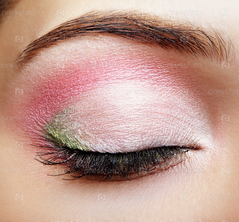 Макрофотография крупным планом закрытого глаза женщины с розовым и зеленым макияжем