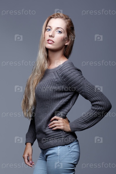 Портрет молодой женщины в сером шерстяном свитере. Красивая девушка позирует на сером фоне студии. Женщина со светлыми волосами и дневным макияжем