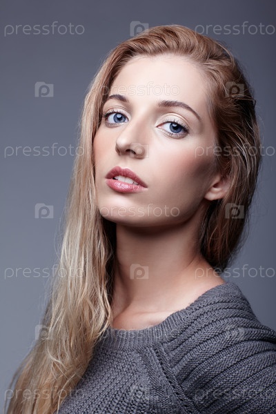 Портрет молодой женщины в сером шерстяном свитере. Красивая девушка позирует на сером фоне студии. Женщина со светлыми волосами и дневным макияжем