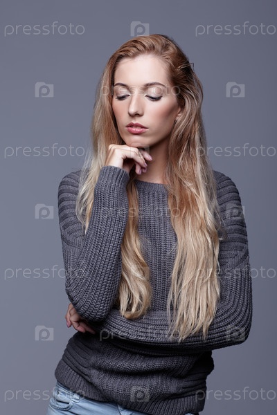 Портрет молодой женщины в сером шерстяном свитере. Красивая девушка позирует на сером фоне студии. Женщина со светлыми волосами и дневным макияжем