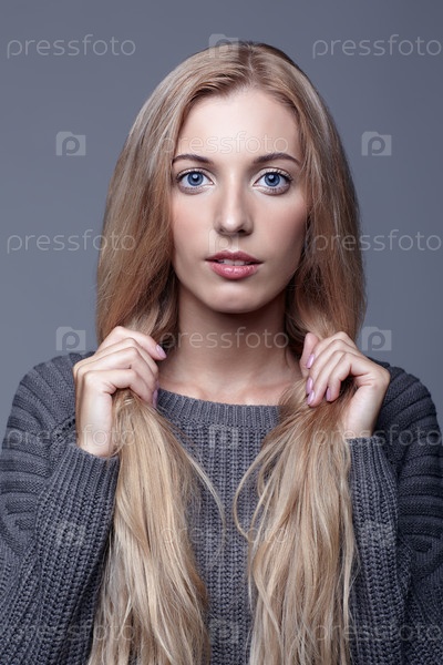 Портрет молодой женщины в сером шерстяном свитере. Красивая девушка позирует на сером фоне студии. Женщина со светлыми волосами и дневным макияжем