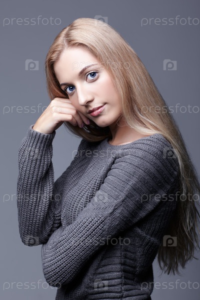 Портрет молодой романтичной женщины в сером шерстяном свитере. Красивая девушка позирует на сером фоне студии. Женщина со светлыми волосами и дневным макияжем с трогательным лицом
