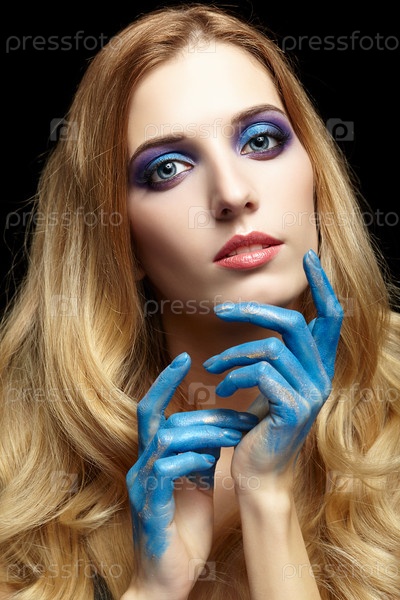 Молодая блондинка с длинными волосами и руками, окрашенными в синюю краску