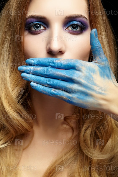 Молодая блондинка с длинными волосами и руками, окрашенными в синюю краску