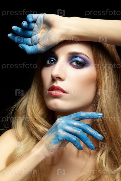 Молодая блондинка с длинными волосами и руками, окрашенными в синюю краску