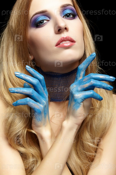 Молодая блондинка с длинными волосами и руками, окрашенными в синюю краску