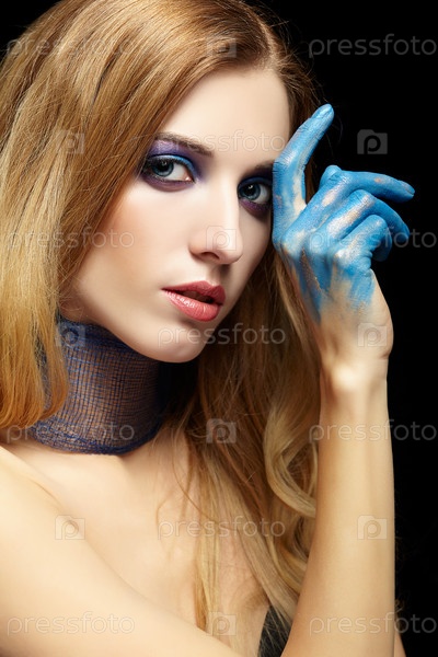 Молодая блондинка с длинными волосами и руками, окрашенными в синюю краску