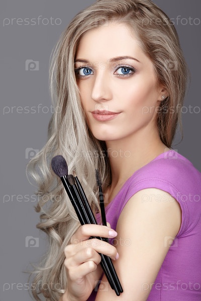 Блондинка-стилист красоты - визажист с кистями для макияжа