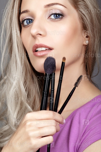 Блондинка-стилист красоты - визажист с кистями для макияжа