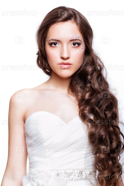 Портрет красивой молодой невесты брюнетки в белом свадебном платье