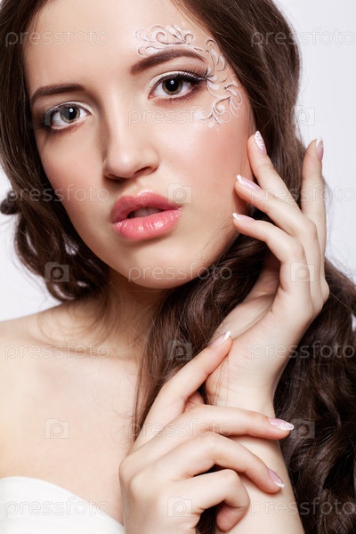 Крупным планом портрет молодой женщины с макияжем лица и маникюром