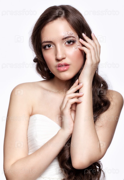 Портрет красивой молодой невесты брюнетки в белом свадебном платье