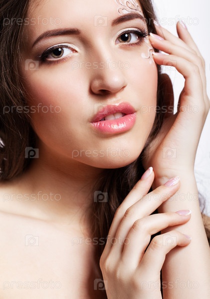 Крупным планом портрет молодой женщины с макияжем лица и маникюром