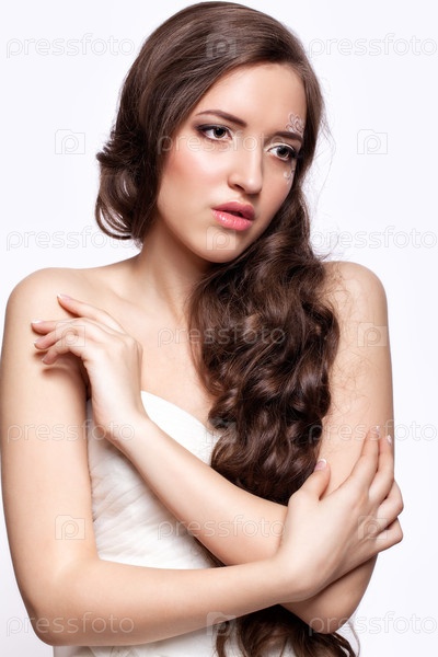 Портрет красивой молодой невесты брюнетки в белом свадебном платье