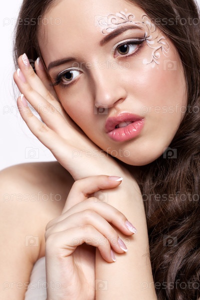 Крупным планом портрет молодой женщины с макияжем лица и маникюром