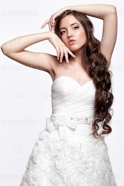 Портрет красивой молодой невесты брюнетки в белом свадебном платье