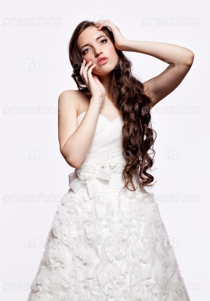Портрет красивой молодой невесты брюнетки в белом свадебном платье