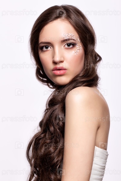 Портрет красивой молодой невесты брюнетки в белом свадебном платье