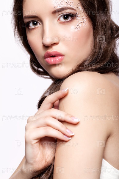 Крупным планом портрет молодой женщины с макияжем лица и маникюром