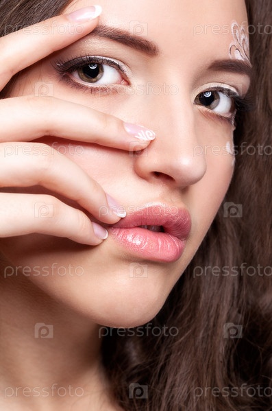 Крупным планом портрет молодой женщины с макияжем лица и маникюром