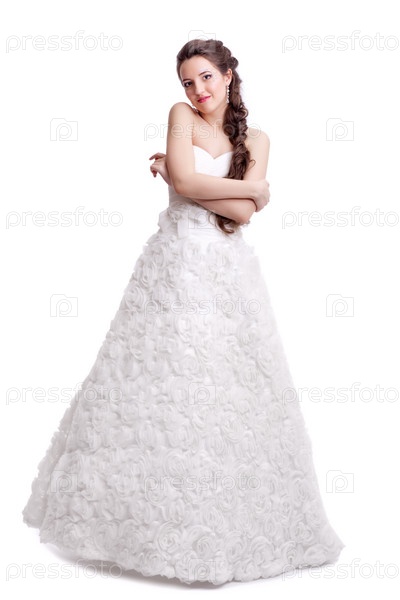 Портрет красивой молодой невесты брюнетки в белом свадебном платье