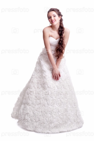Портрет красивой молодой невесты брюнетки в белом свадебном платье