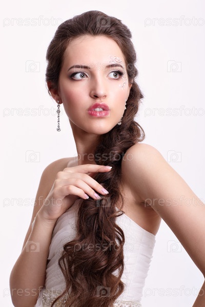 Портрет красивой молодой невесты брюнетки в белом свадебном платье